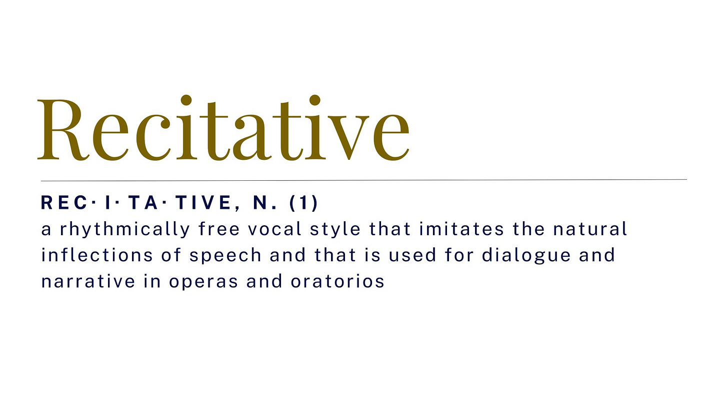 The recitative is a musical declamation sung in the rhythm of speech and used to forward the plot of an opera. To put it simply, it’s an opera’s version of a dialogue scene where the characters sing/speak about what’s going on. In these instances, the music becomes an element of the background, highlighting the characters’ dialogue rather than guiding it. Within the medium of film, this could be compared to any dialogue scene. In fact, this operatic method more than likely played a role in how music developed for the screen.
