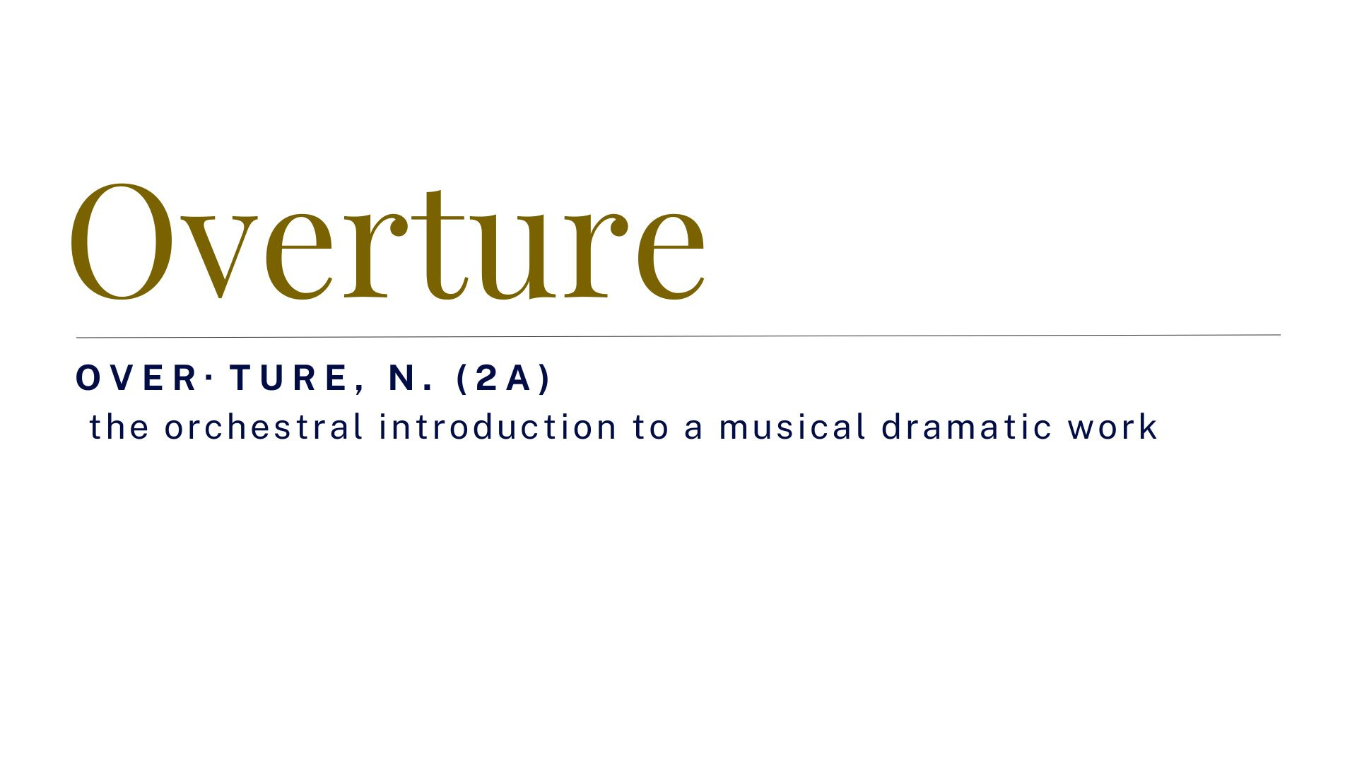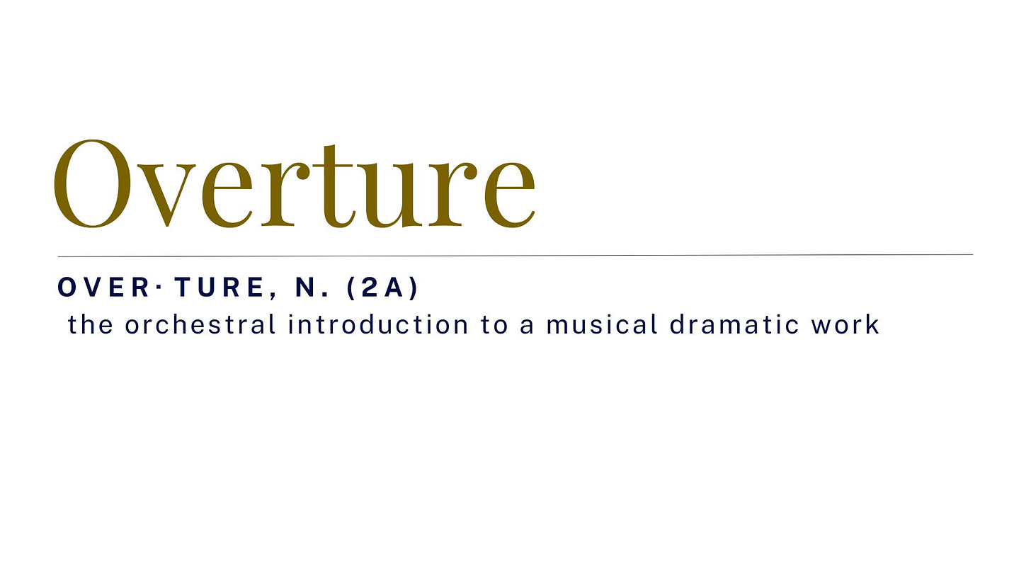 In opera, an overture is meant as a way to introduce the piece. It tells the audience that the show is starting, as well as what the story will be about. It’s even combined with a spoken or sung prologue before the story begins.